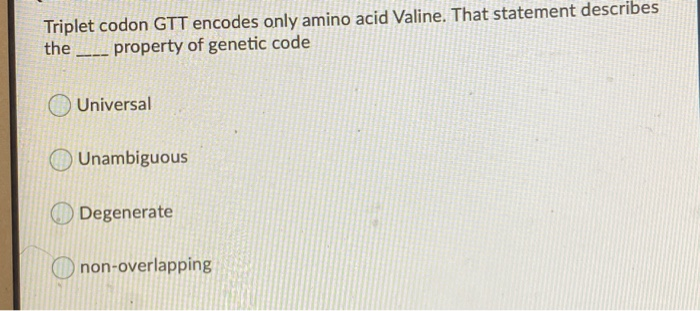 . Redundant but not ambiguous. The genetic code is described as degenerate because often more than one codon codes for the same amino acid. QUESTION 36 The genetic code is best described as O nonsense O ambiguous but not redundant.
